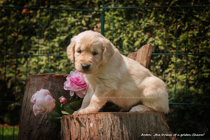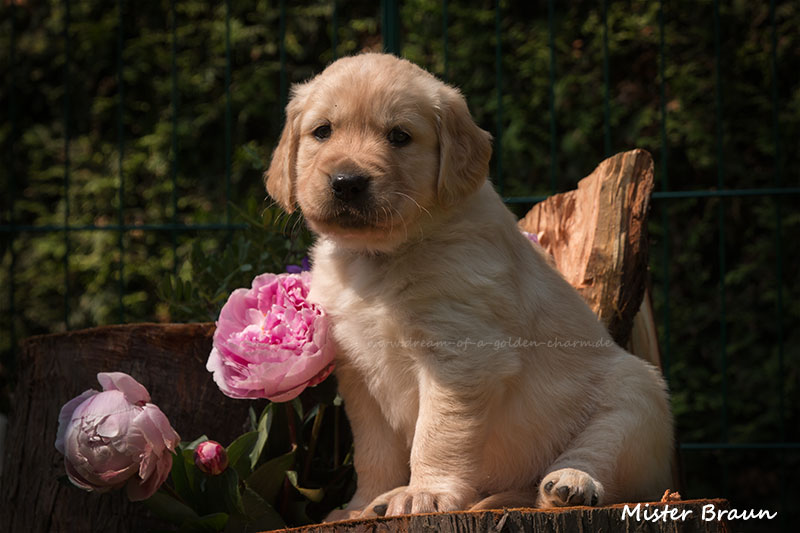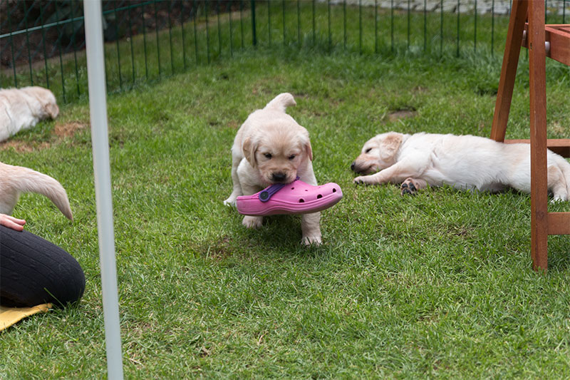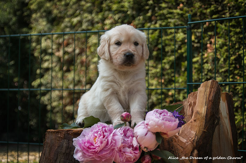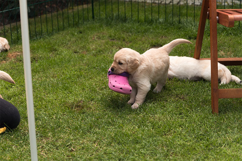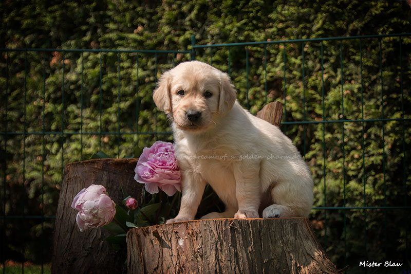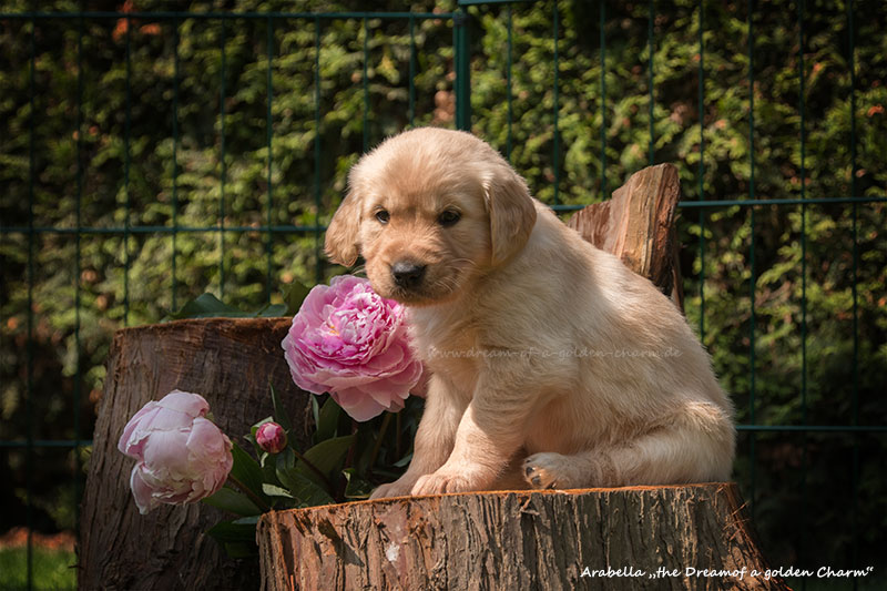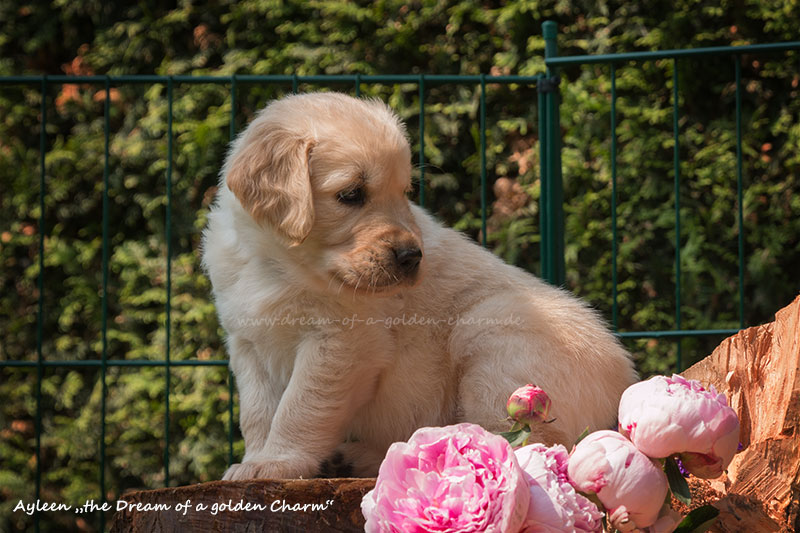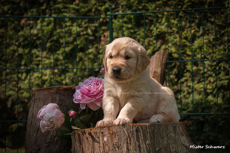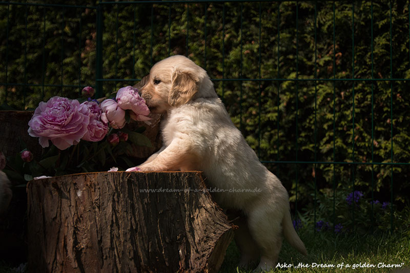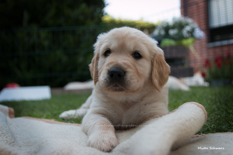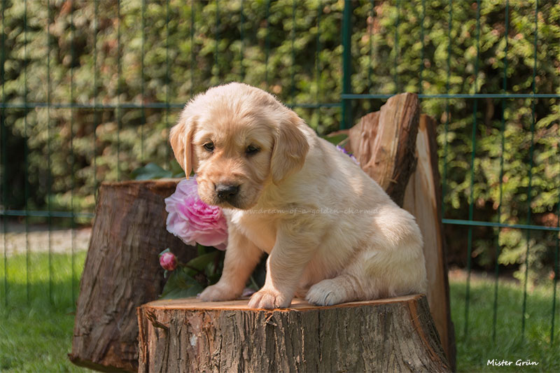 Unsere Goldbärchen gehen jetzt in die sechste Woche und werden immer fideler. Die kleinen Fellnasen können schon richtig toben, knurren und das Fressen aus dem Napf klappt auch schon immer besser. Es gibt jeden Tag so viel neues zu entdecken wie z.B. Baumstämme erklimmen, den Garten neu gestalten, Mama Charmings Rute zerwuseln und die ersten Gegenstände wurden auch schon apportiert. Und wie es sich für einen Retriever gehört, haben wir natürlich auch schon den Weg in die Küche gefunden.